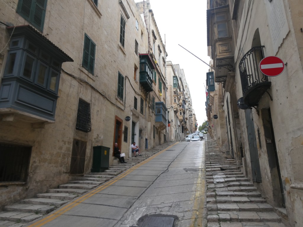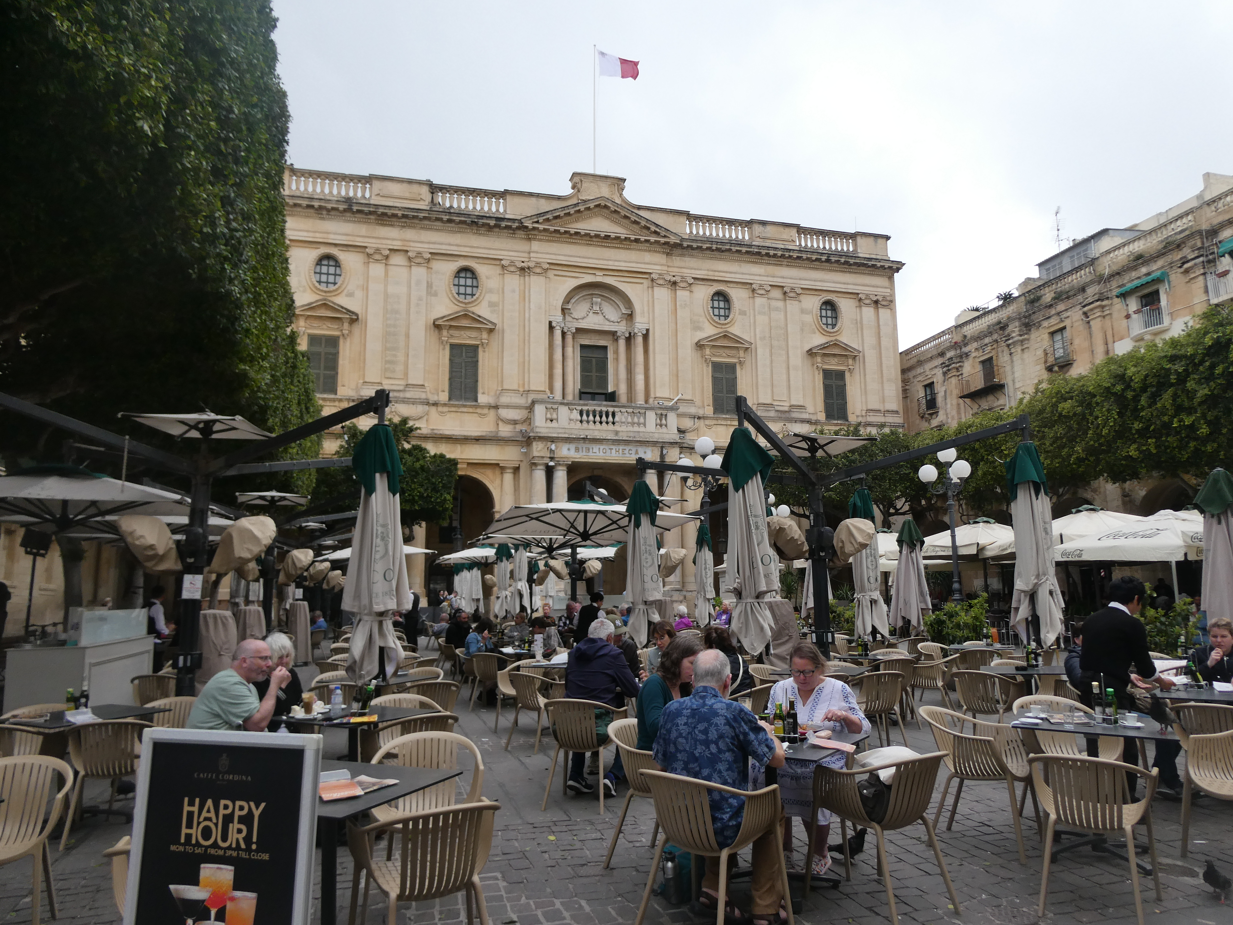While yesterday had been sunny and breezy, today is overcast and breezy- but we’re undeterred and can get a first look at this most beautiful and historic capital. The palace is open to visitors but we’ll leave it for now and stroll [carefully] the streets to get a flavour of the place. The square is at the end of a main street, Republic Street, a wide, paved, straight road lined with elegant old buildings of honey coloured stone. This large square leads to a neighbouring, smaller one housing a library, in front of which a terrace is crammed with cafe tables.
