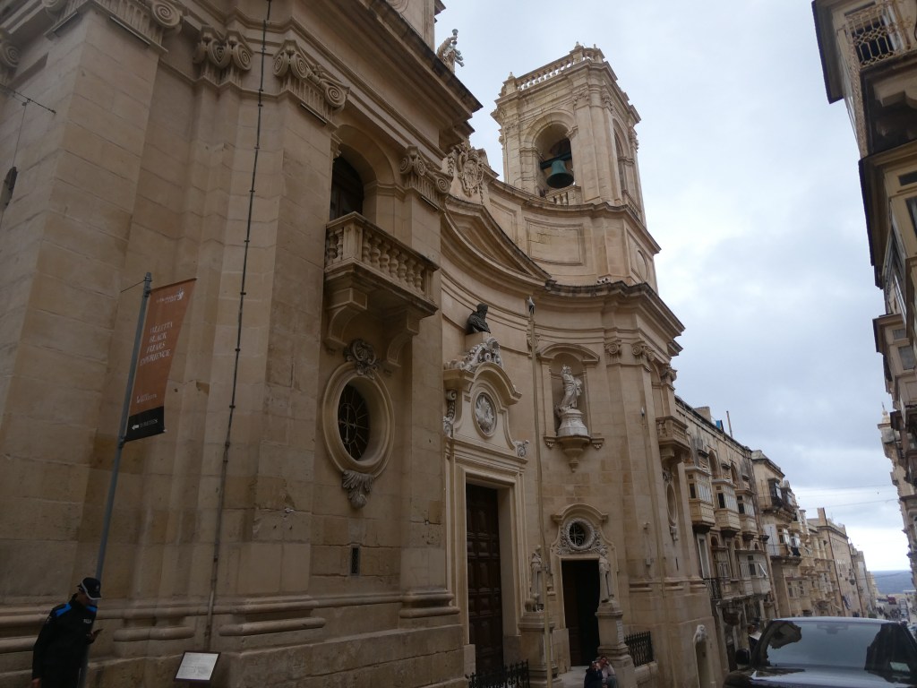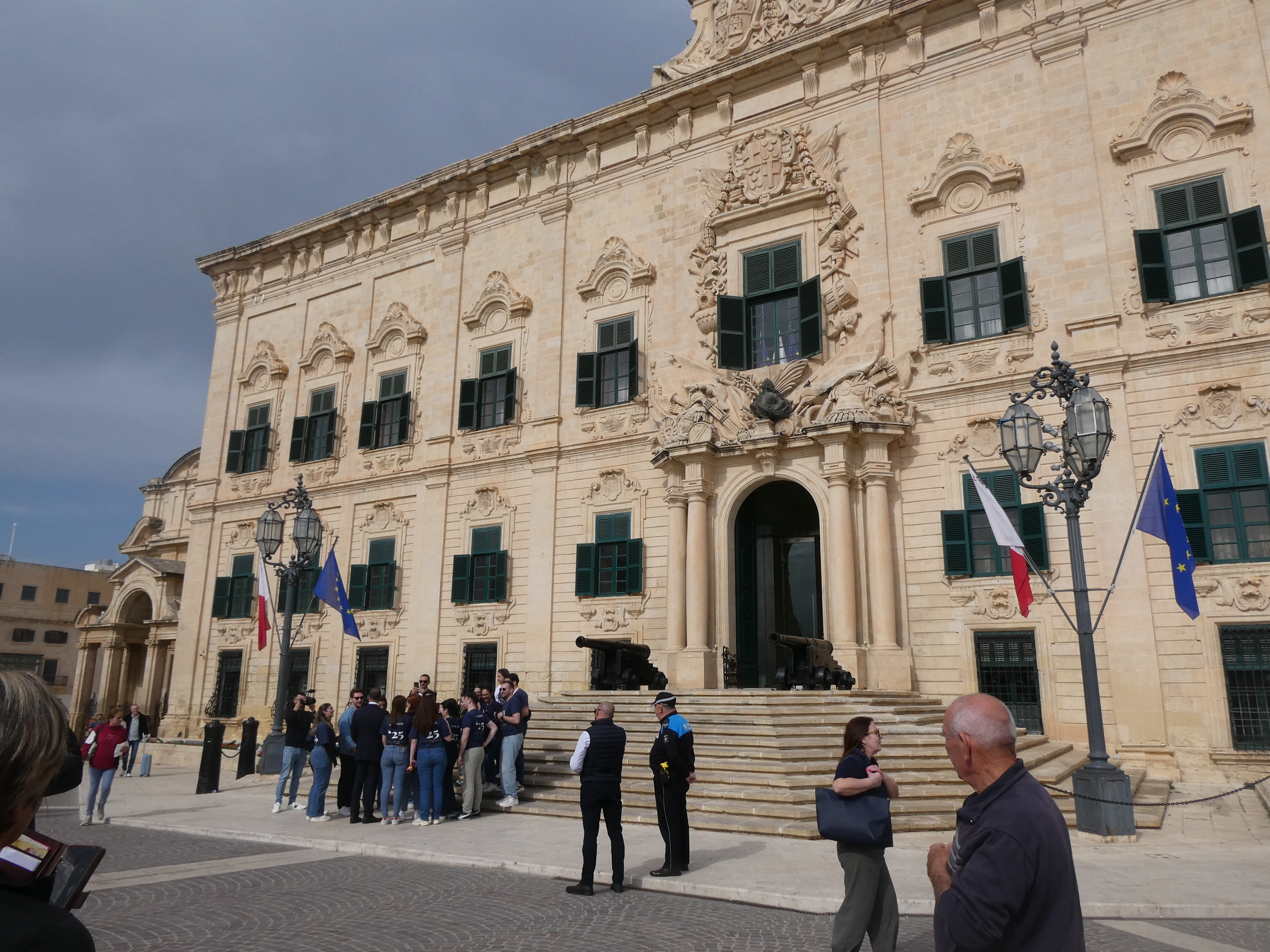 The entire street is thronged with tourists, even on this cool, windy, overcast March day. the rest of the street is lined with gift shops, cafes, bars and the art gallery- which is not the home of the Caravaggio exhibition, we are to learn. It is housed inside St John’s cathedral- further back, where a long, snaking queue is waiting. We continue along to the end of Republic Street and out into another large square with a vast, elegant facade. A throng of flag-waving, whistle- blowing teenagers in matching T-shirts is on the steps, just as a cavalcade arrives bearing the prime minister! There is very little in the way of security. We could walk right up to him and splat a custard pie in his face should we wish- which we don’t. He spends some time chatting to his young fans.