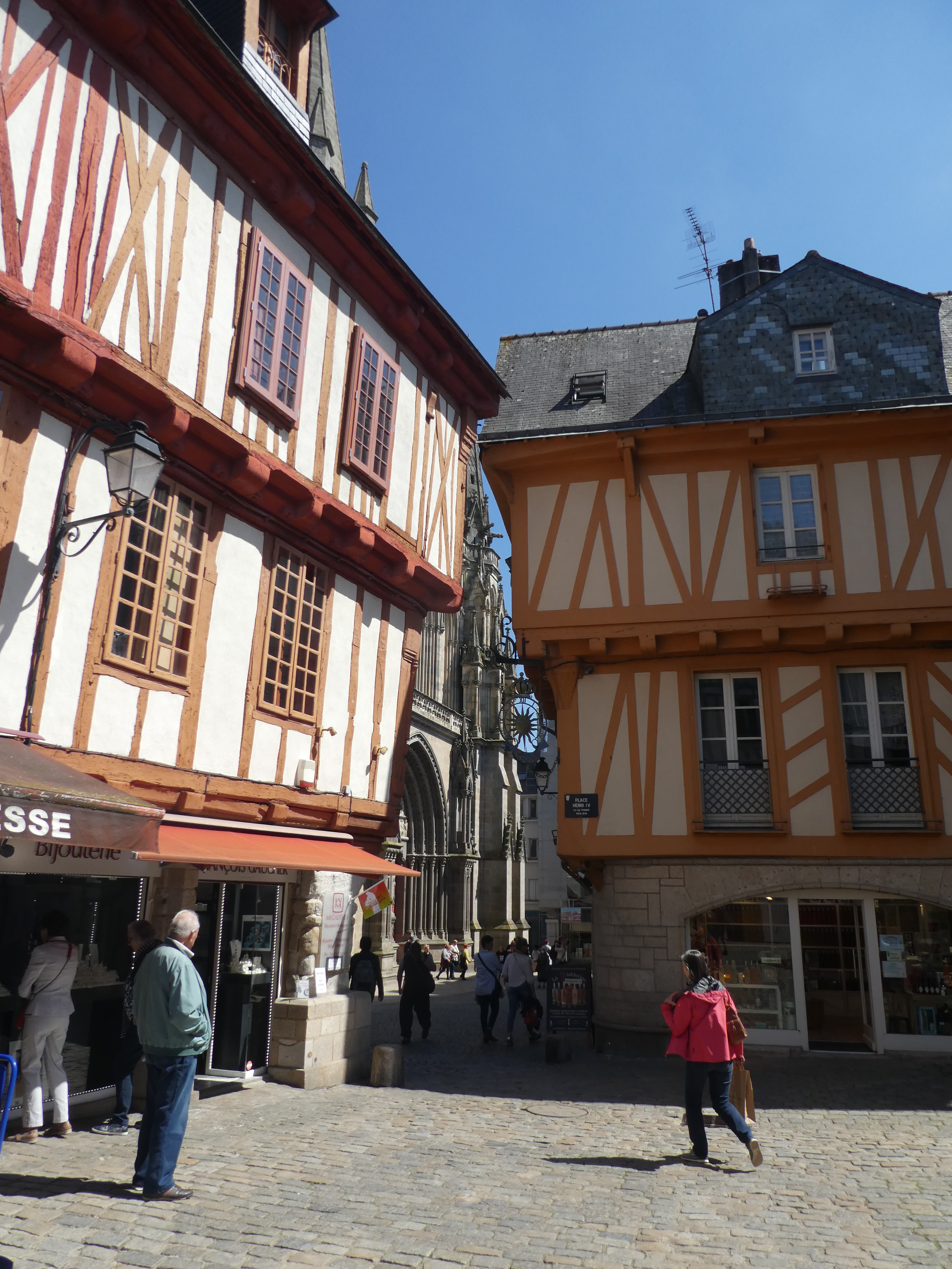 Vannes is a very pretty, medieval town in Brittany. We’re here for a few days’ second visit, enjoying beautiful warm sunshine for a walk along the footpath from our site, which begins in woods and emerges to boatyards, then a quayside thoroughfare into the centre of town. As we near the town it becomes landscaped with seating areas and planting. there’s a large concourse in front of the tourist information office, where the weather has brought out a lot of visitors, keeping the neighbouring cafes and ice cream vendors busy.