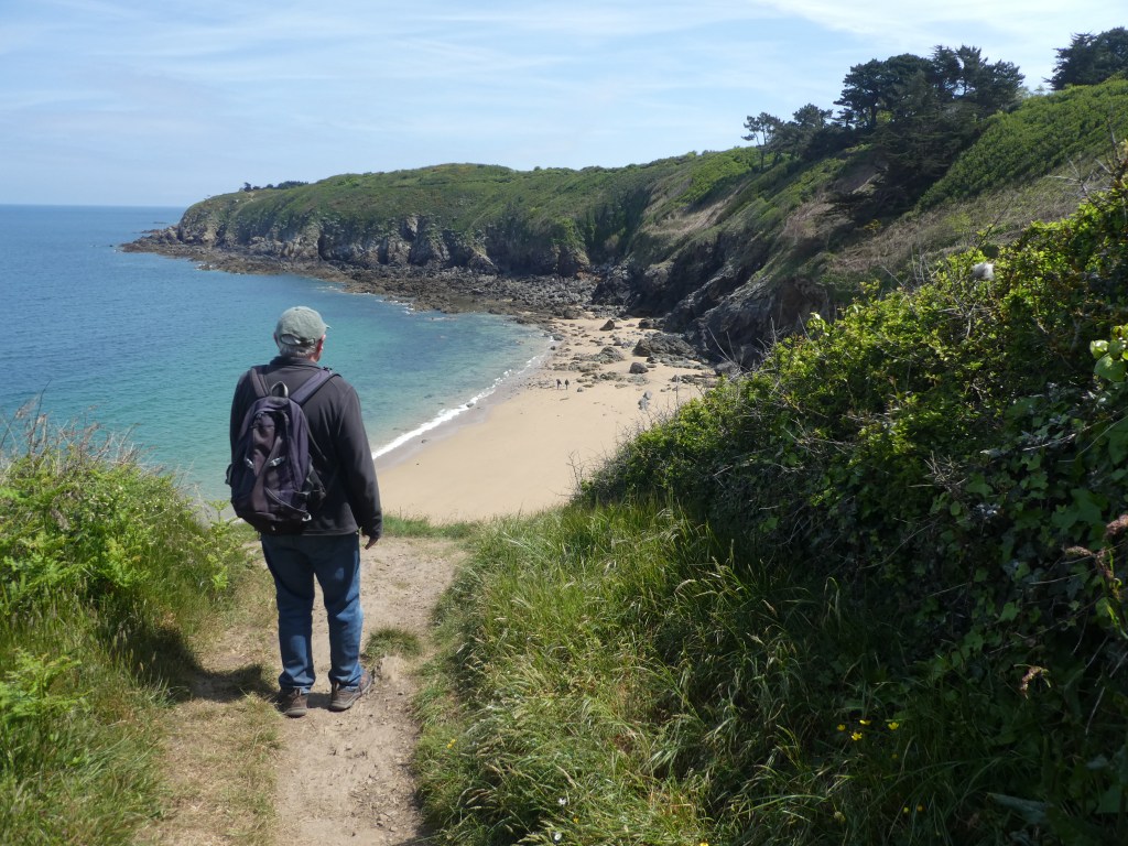 At last we reach a point above St Cast’s harbour with a panoramic view of the surrounding coast, then it’s a short stroll down to the port, which is a proper working base for fisherman, and where the dockside has a few promising restaurants and bars. We reward ourselves with a beer before slogging back up to our site- but not before inspecting the restaurant menus.