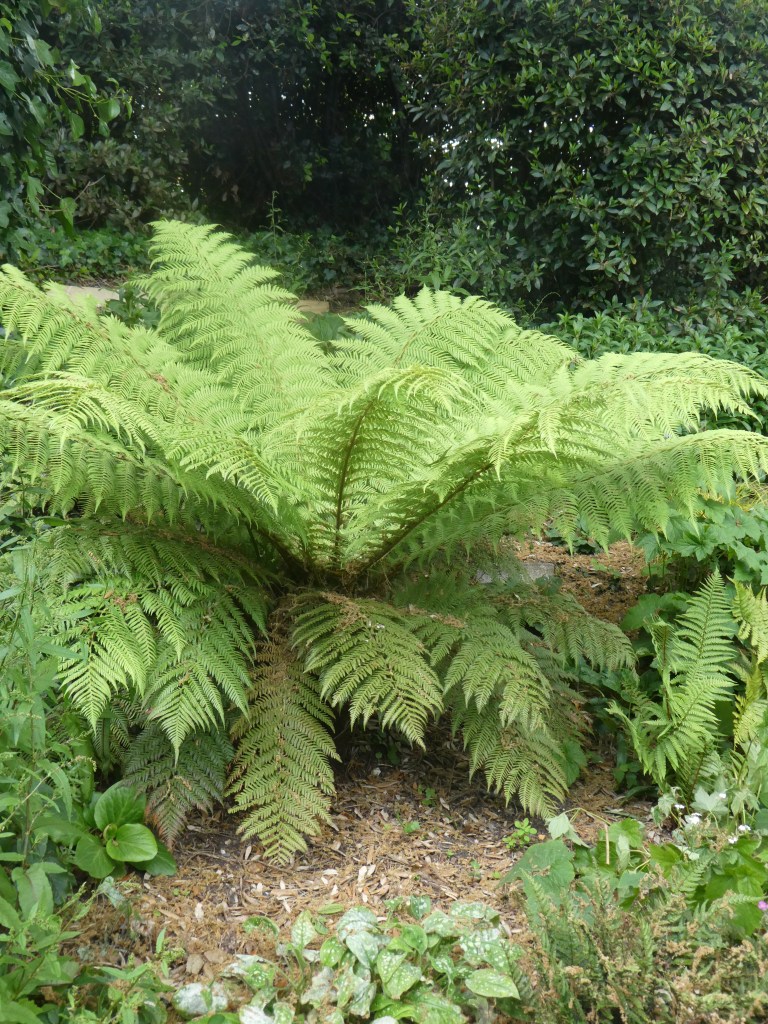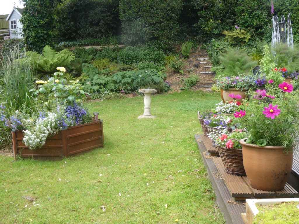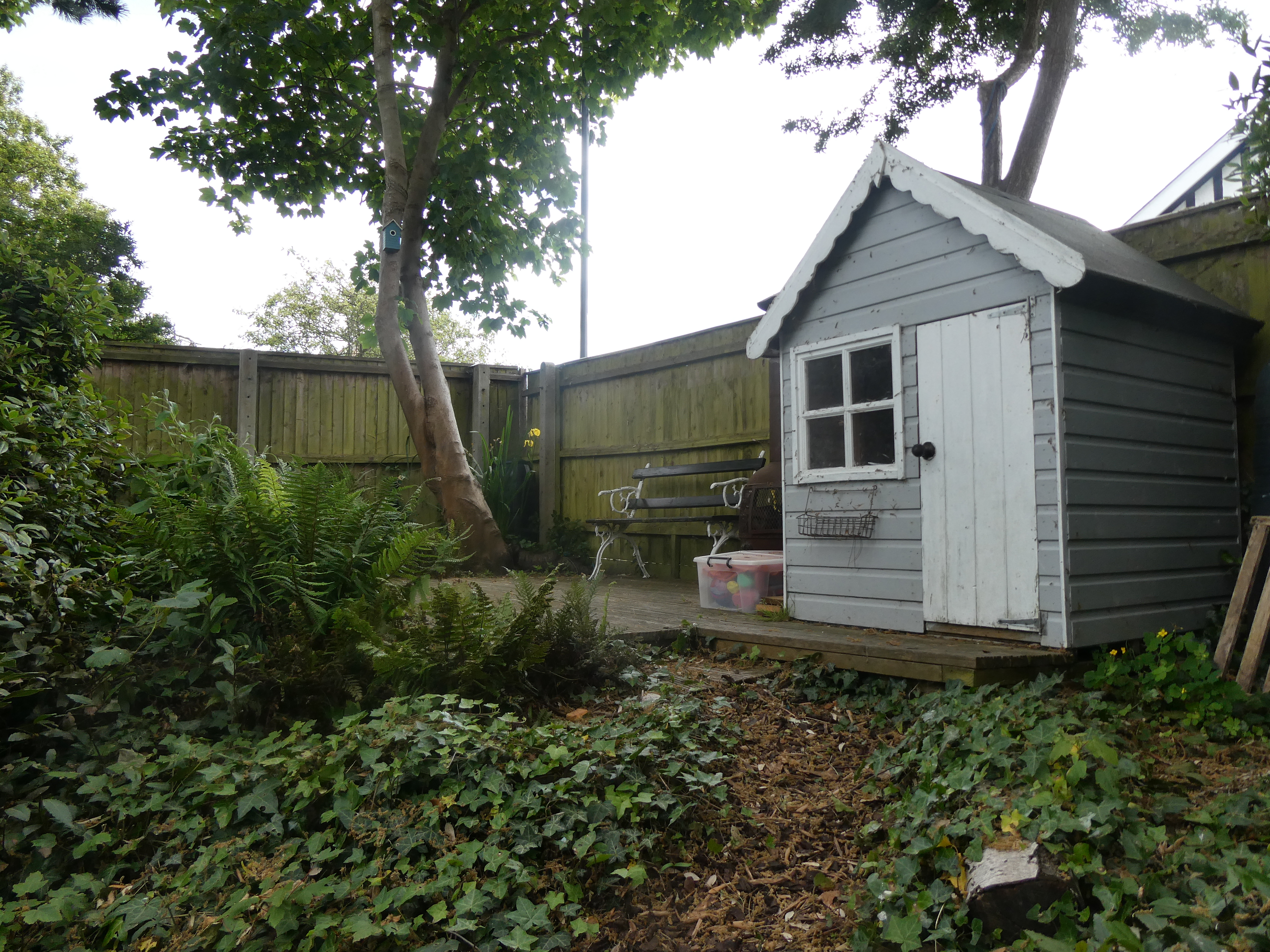 At the top of the bank, accessed by a cute path that Husband installed is a wildish space. Here he also put in a pond which has remained stubbornly devoid of life since its arrival [so much for ponds being a magnet, and all that…]. The pond is flanked by more ferns and a lot of weeds. Opposite, on the other end of the decking is a small house that we placed here for small people, although visiting grandchildren have, thus far, studiously ignored it. This may be due to the spider population which enjoys the accommodation.