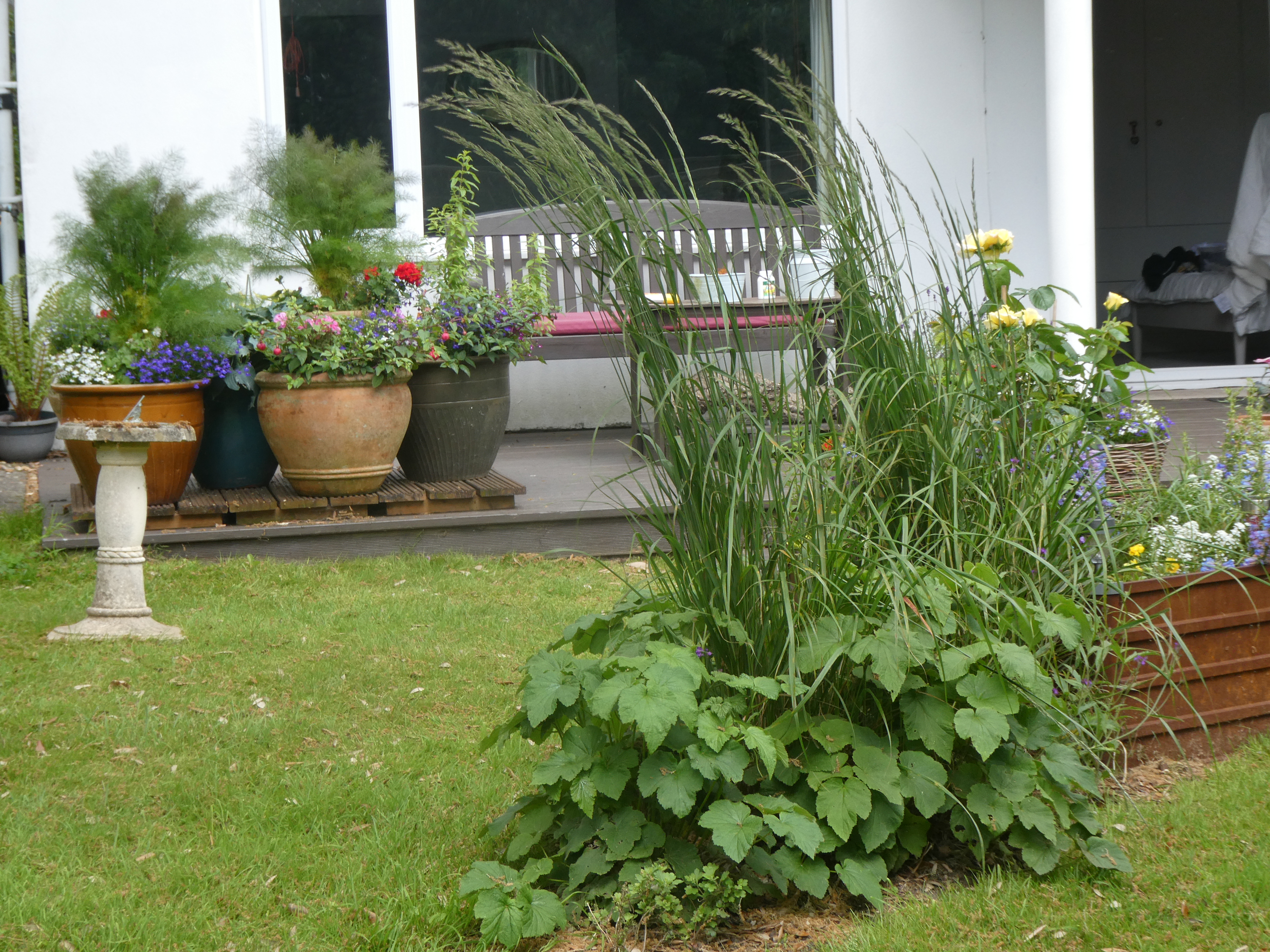 The few sunny parts of the garden are occupied by pots of annuals and by tomato plants, which I had to buy this year, as my seedlings succumbed to the cold.