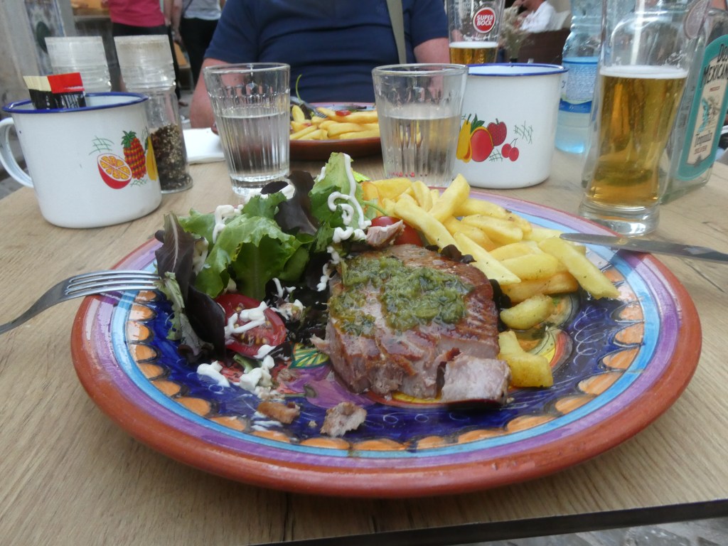 The next morning, we set off [in our shorts and T-shirts] in search of brunch, having first bought a phone charger due to not packing one, from a store at the end of our street. There’s a breakfast cafe just around the corner which looks promising, although the menu is beyond my rusty Spanish skills [which were never great to start with] and the staff seem unwilling to engage in a ‘Spanglais’ garbled conversation. Plates of toasted baguettes with delicious toppings keep emerging, which we decide would be perfect for us- but what are they?