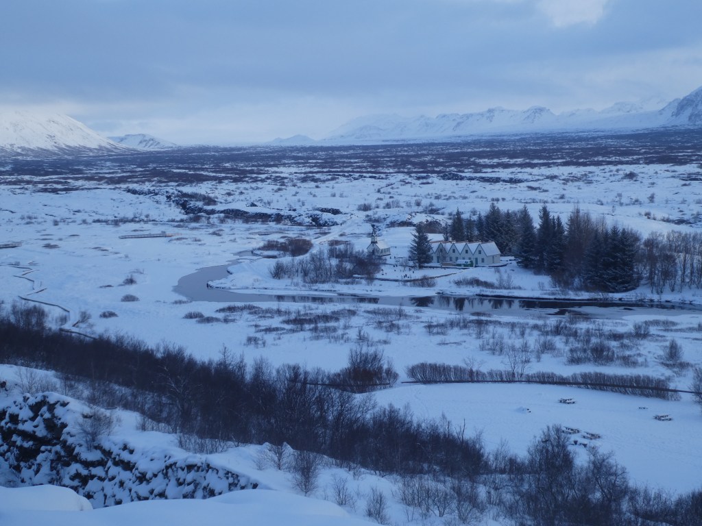 There was time for a hot drink in the cafe before we left. By now the weather had deteriorated further but we’d still to visit the national park [first on the list the day before]. The weather had worsened again, rendering visibility a problem for our driver, who’d also to deal with the high wind, which made steering difficult. Albert asked us to move up to the front seats of the bus to help with stability- even so it was slow going and by the time we got to the National Park the light was fading and the cafe had shut. We spent a few minutes there, but crossing the two tectonic plates and seeing the fissures in the snow was still thrilling.
