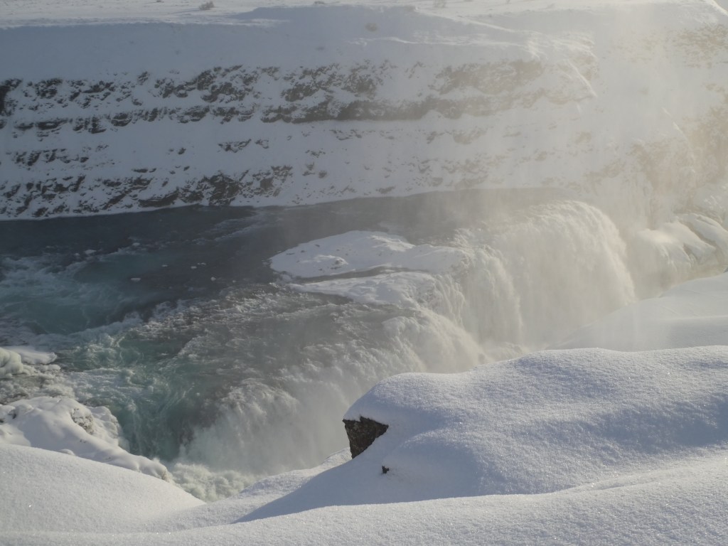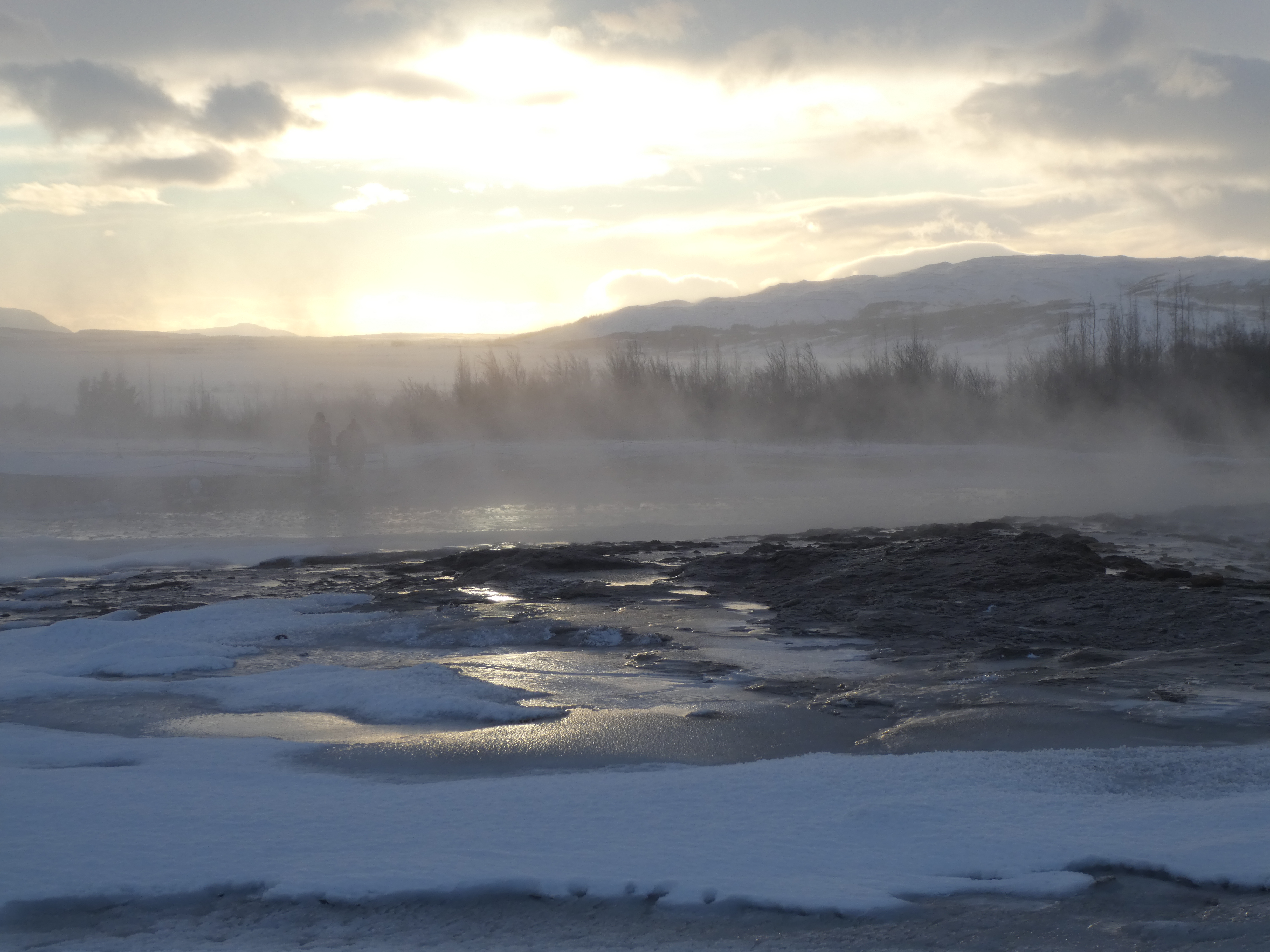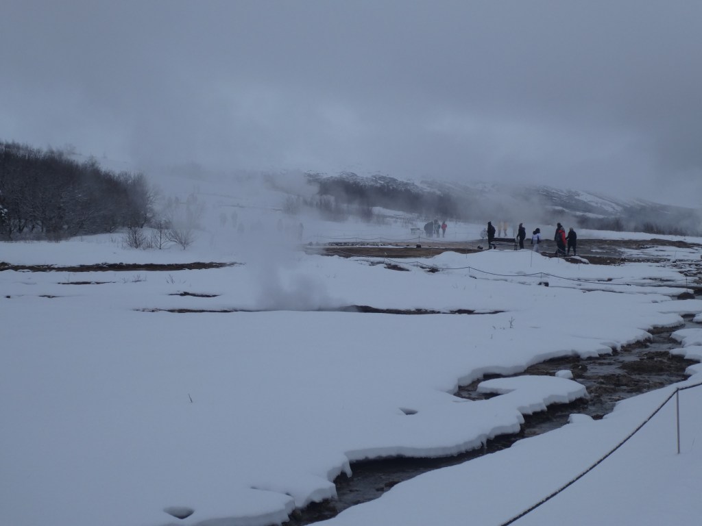 En route to our next stop- the geyser- the weather did an abrupt u-turn. A viscious wind sprang up and blew a blizzard across almost horizontally, so that when we pulled in at the car park for the thermal springs and pools and got out of the bus it felt like being cut in half, such was the ferocity of the gusts. We battled across the slippery road and up the path to the geyser, where we stood just long enough to see the spout fly up into the air in a wheezy plume and be blown sideways. Then we felt we’d had enough, although as we turned to head back several people in wheelchairs were arriving, pushed by brave and strong helpers, demonstrating a tenacious will to live life to the full!