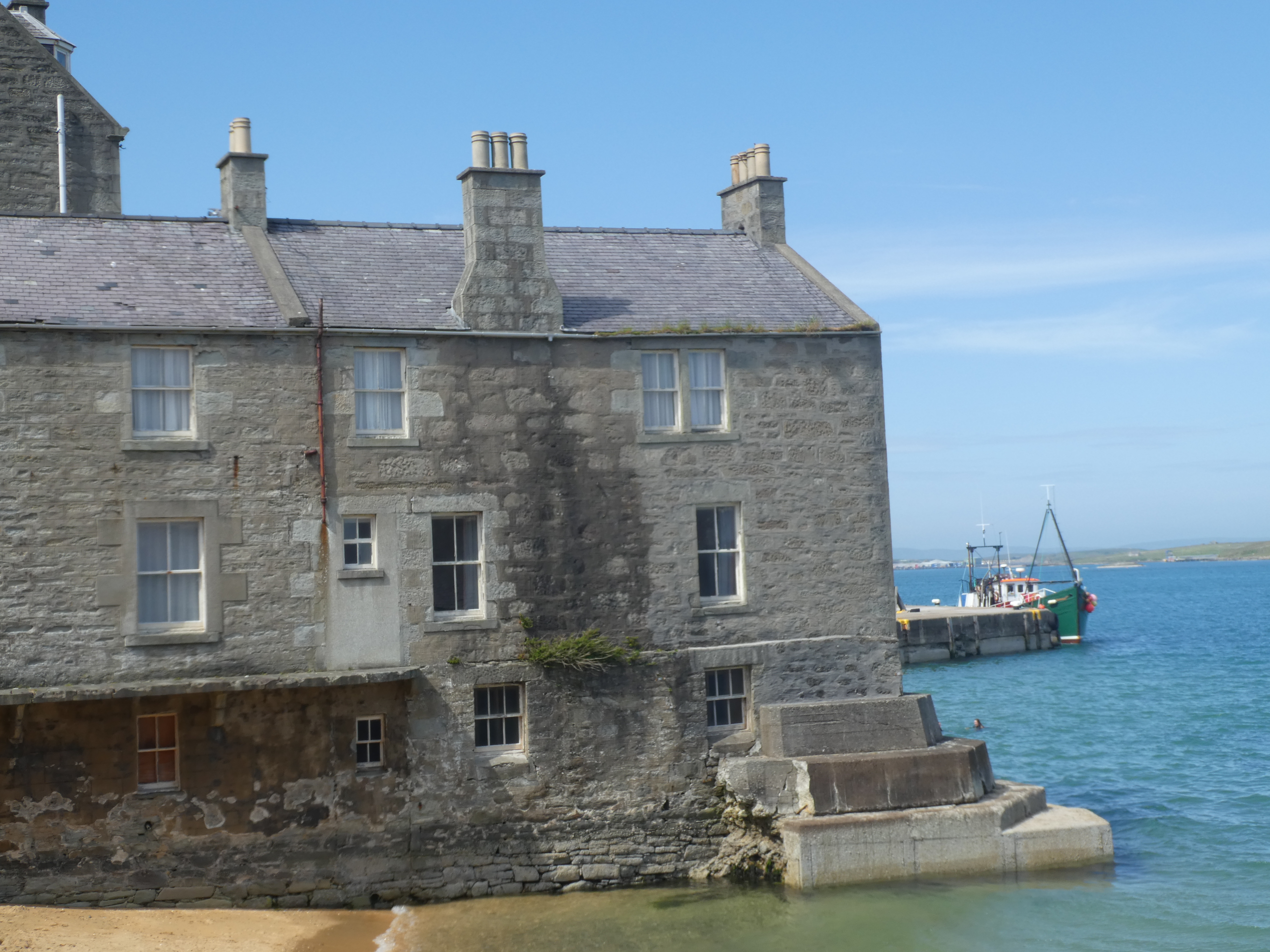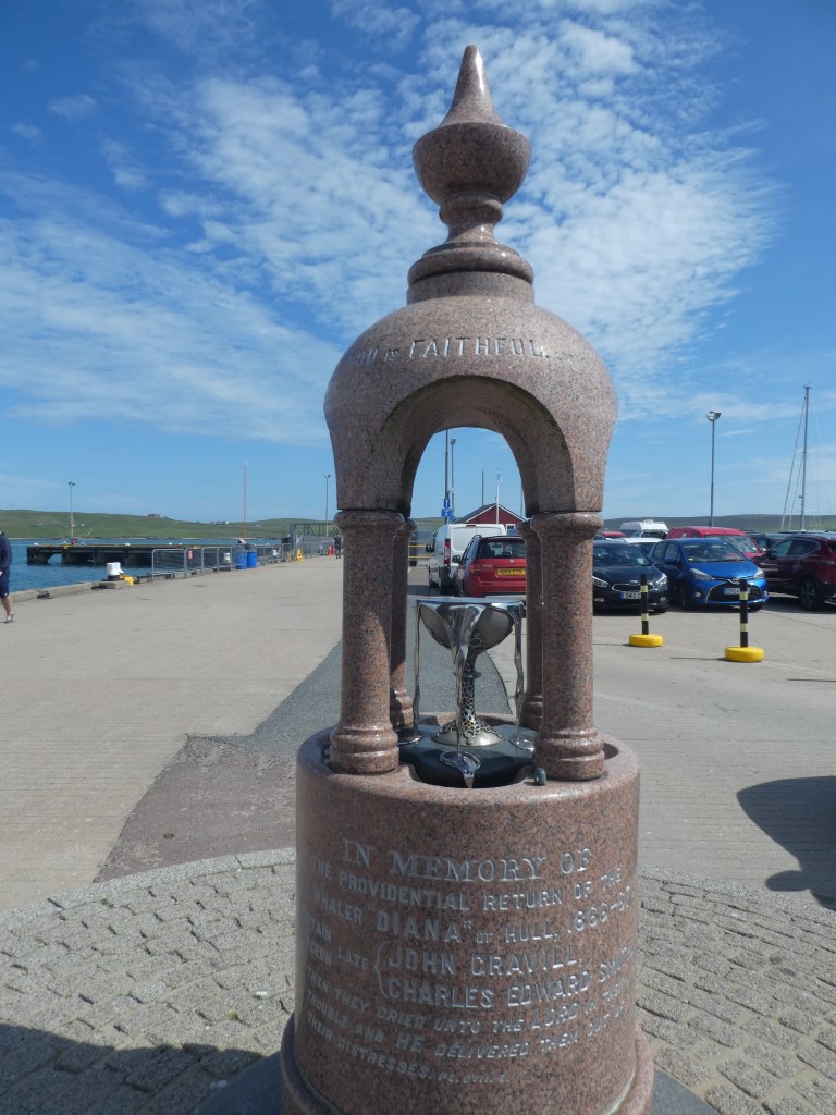 But today it’s quiet, as everywhere else and we can walk down the centre of the narrow, slabbed streets without worrying too much about traffic. Away from the centre, on the seafront street I search for Jimmy Perez’ house. I downloaded several Ann Cleeves books before we came and have seen a couple of the televised versions of her Shetland detective novels. There is nothing to indicate which grey, stone, waterside cottage is his- but then of course he isn’t real and is not deserving of a blue plaque. I narrow it down to two possibilities. Perhaps you, reader, can enlighten me?