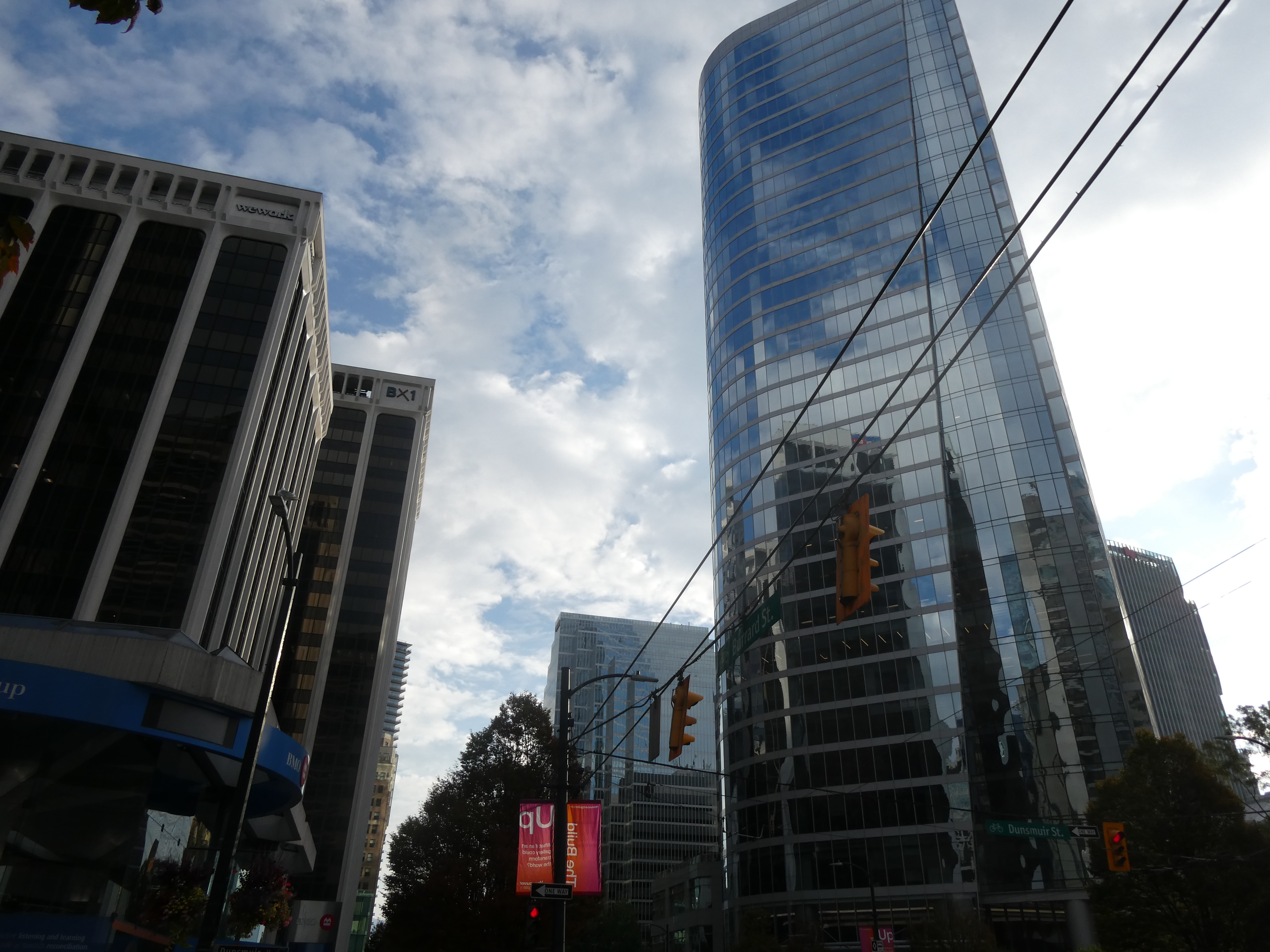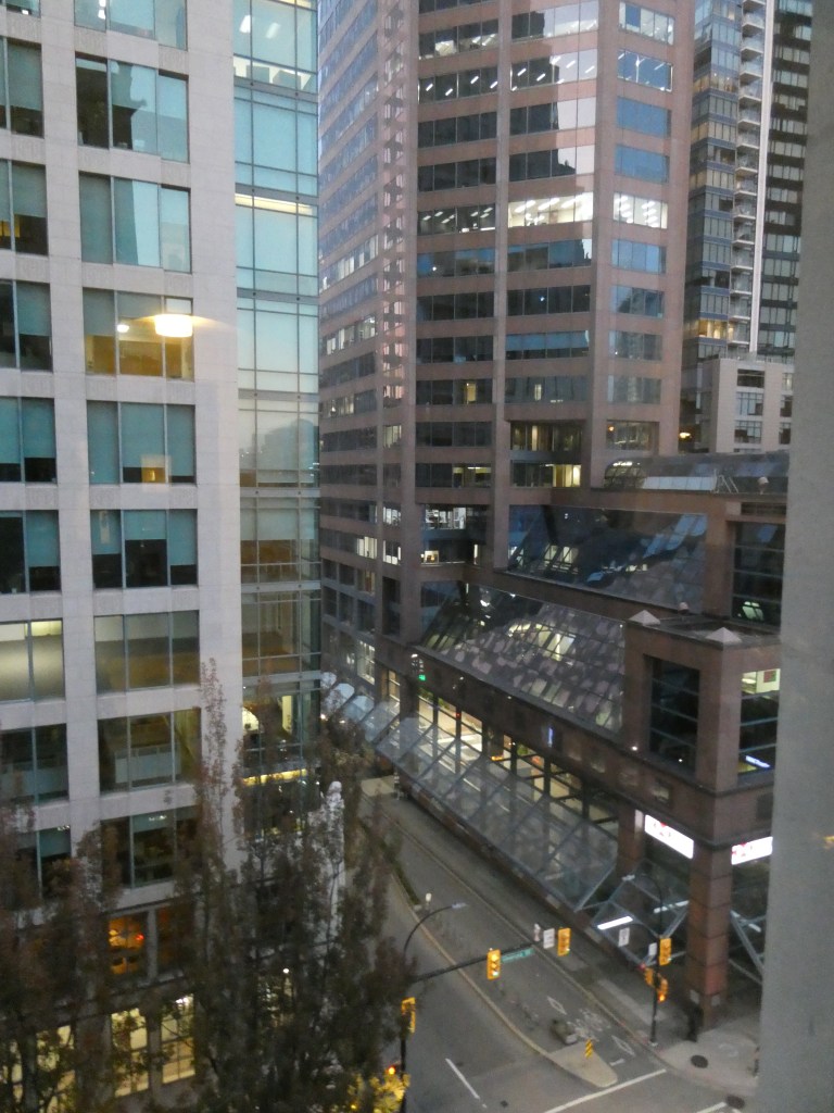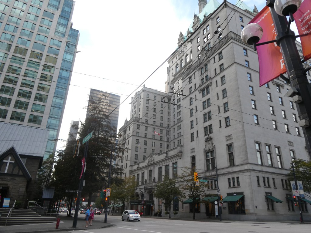 It’s about 45 mins in the heavy traffic but the tall towers of central Vancouver appear, shiny and reflective and contrasting with our hotel- the grand old Fairmont, an enormous brown edifice, then we’re plunging through a gap to an entrance [there are several] and stumbling out on to the pavement, grabbing cases, saying our goodbyes.