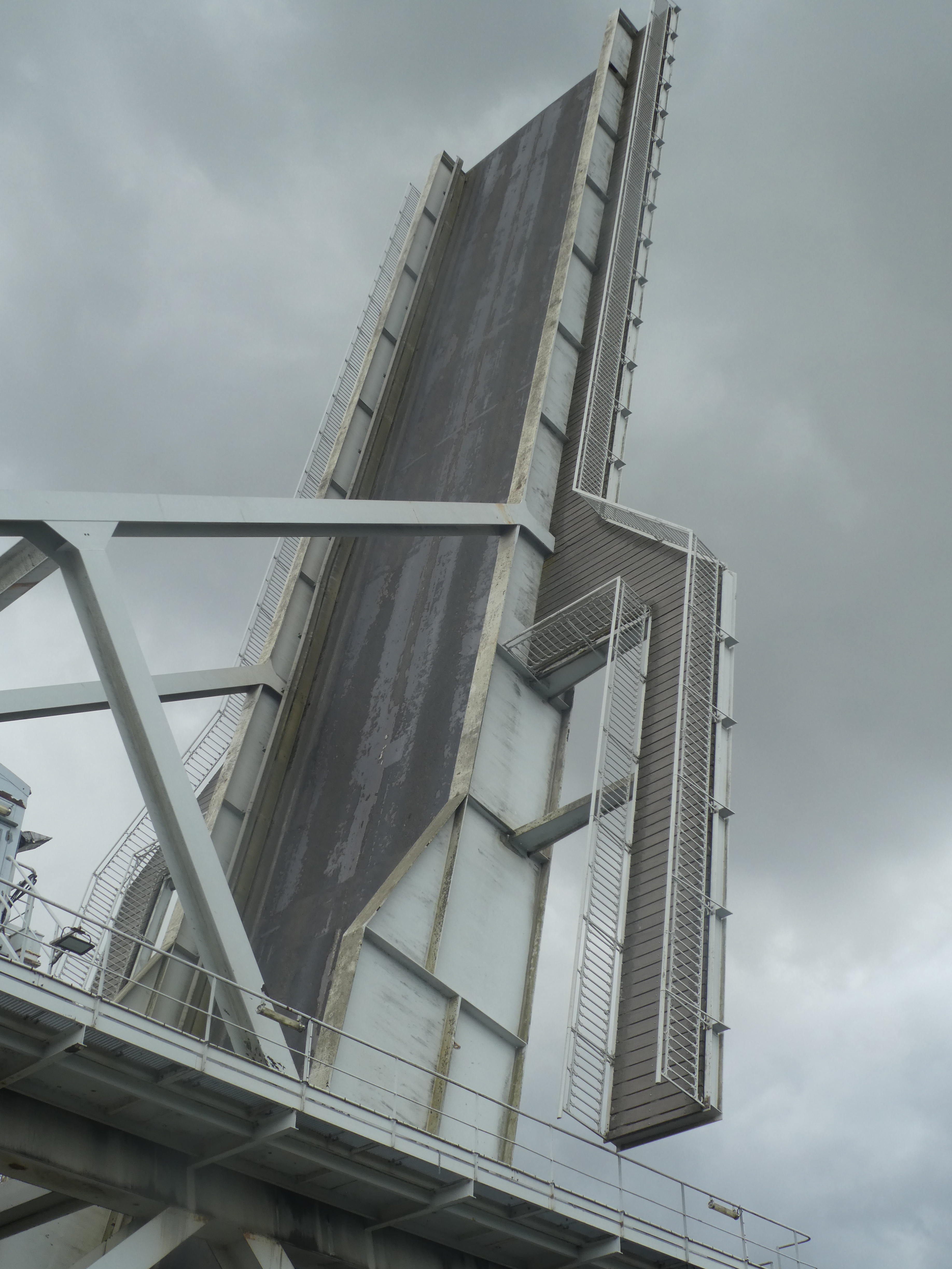 We cross the bridge and slip down the opposite side of the river, which leads to the estuary- and it’s beautiful and wild with many foraging seabirds. Further on there’s a short stretch of nature reserve and we arrive at Merville, the tiny town we stayed in before, which has a broad beach and a few cafes. On our last visit we’d anticipated getting a meal here only to discover the bars and restaurants were all closed on Mondays and Tuesdays- commonplace in France. On our return the Pegasus bridge opens right up to allow a sailing boat through, an outstanding sight!