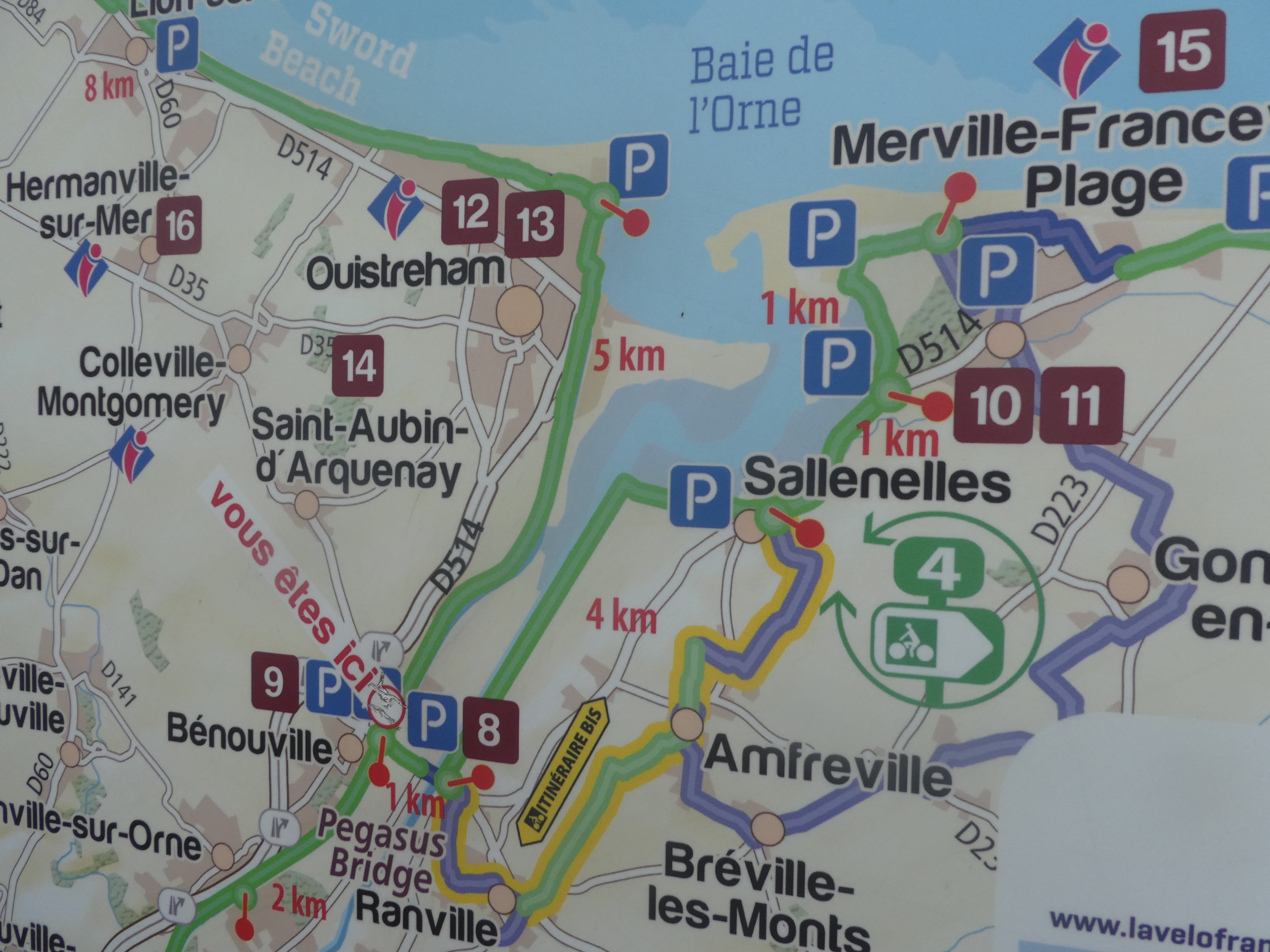 It’s overcast now, here in this northerly part of France, but not cold or raining. There’s an excellent cycle path along the river that skirts our site, the Orne, and we’ve cycled a little of it before while staying a short distance along the coast. It isn’t far along to the Pegasus Bridge, a facsimile of a world war 2 bridge, now a substantial tourist attraction with war themed cafes and gifts for sale. We’ve visited one of the cafes before and been unimpressed by the welcome from the staff so we avoid it this time.