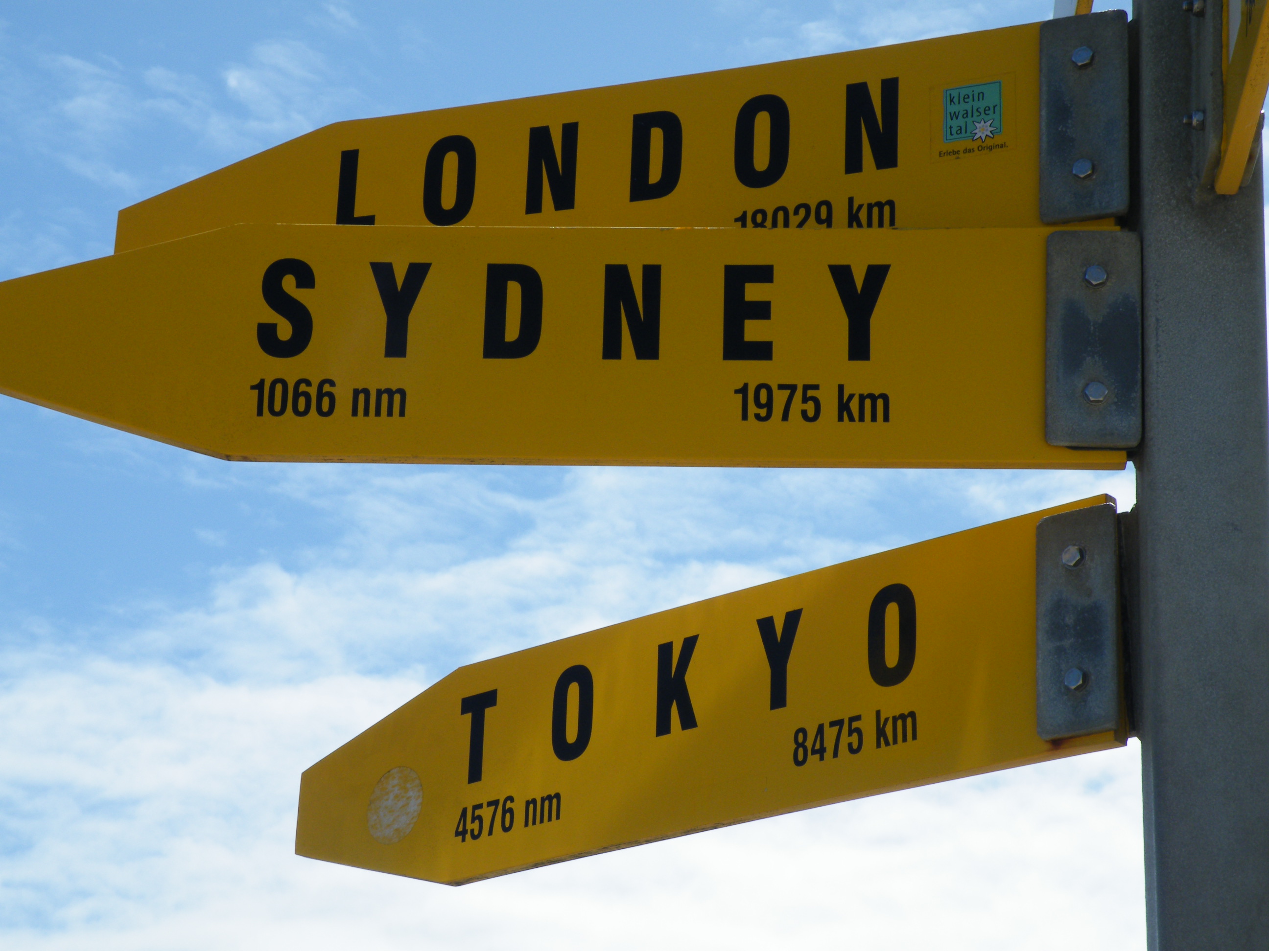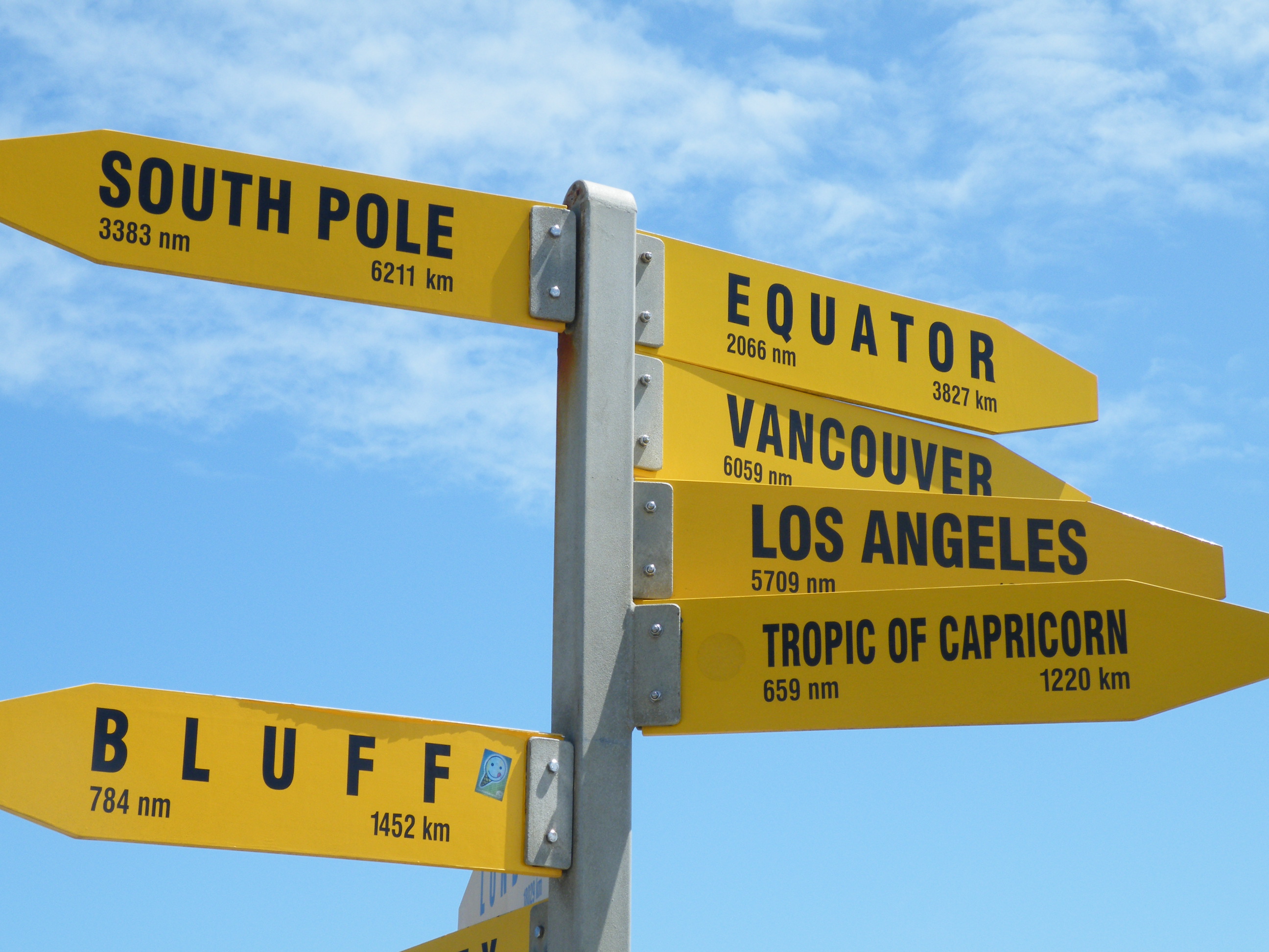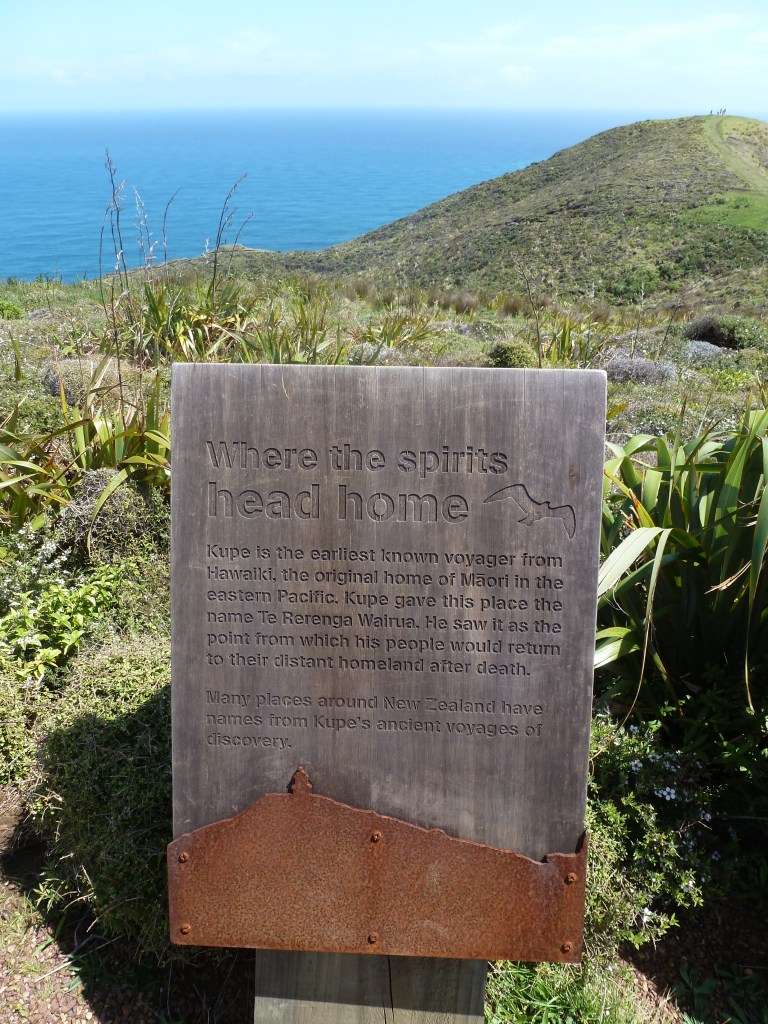 Here, as all of the coast throughout New Zealand the waters were clear, striking, azure blue and turqoise, topped with white froth. At the top of the headland where the two seas can be viewed in a turbulent cauldron there is a lighthouse and a couple of helpful signposts displaying distances.