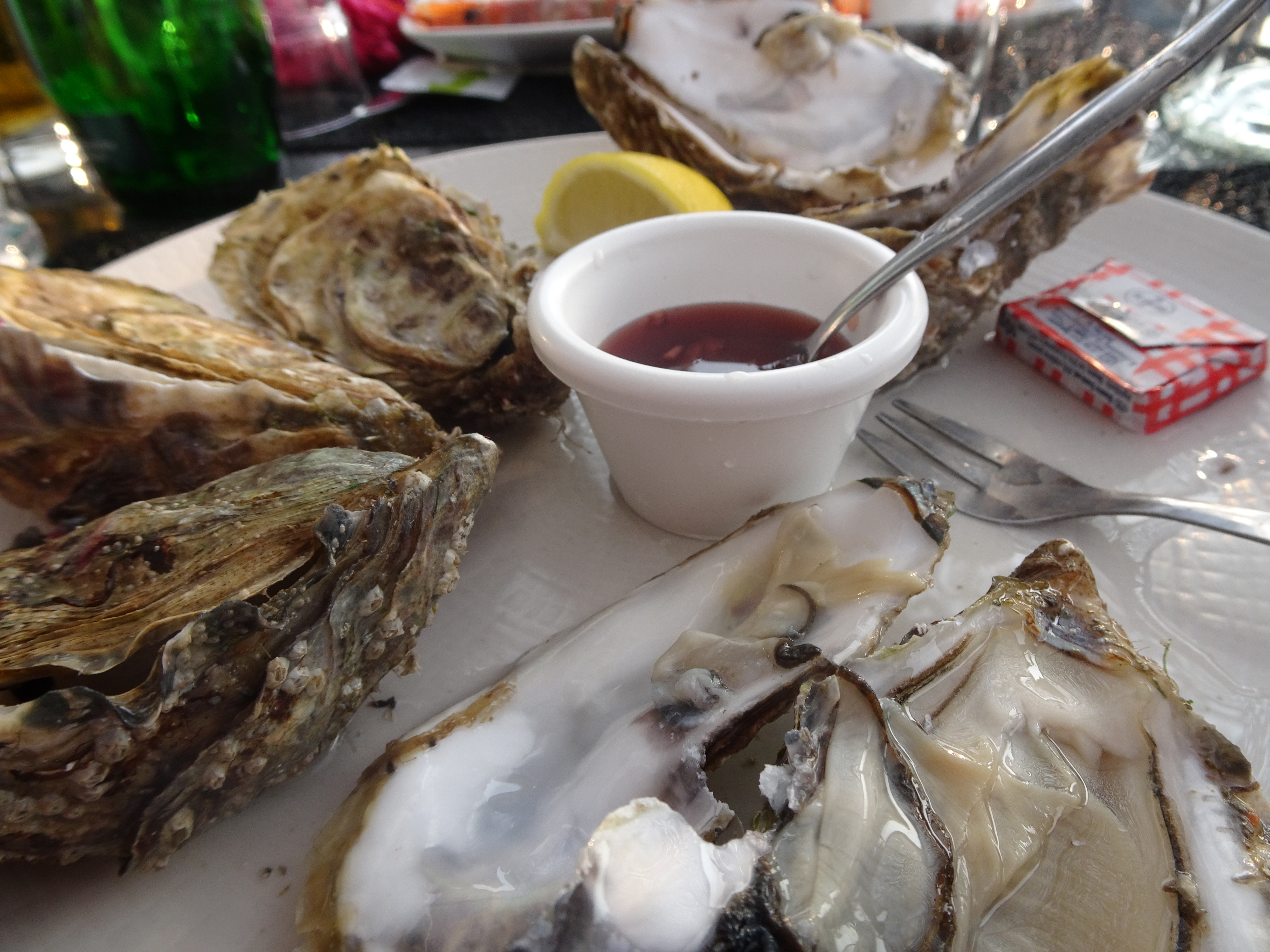 The Cadillac bar, outside the site entrance does not have an extensive menu but does offer grilled sardines besides the obligatory pizzas and we’re happy to give it a go. To begin, we share a salad, which when it arrives consists entirely of sliced tomatoes in a dressing with a few olives. It is utterly delicious, due I think, to the quality of the tomatoes and the tasty dressing. The sardines come and are salty, crispy and scrumptious. There’s excellent bread and some local, Noirmoutier potatoes. As a meal it’s simplicity itself but nothing could be tastier.