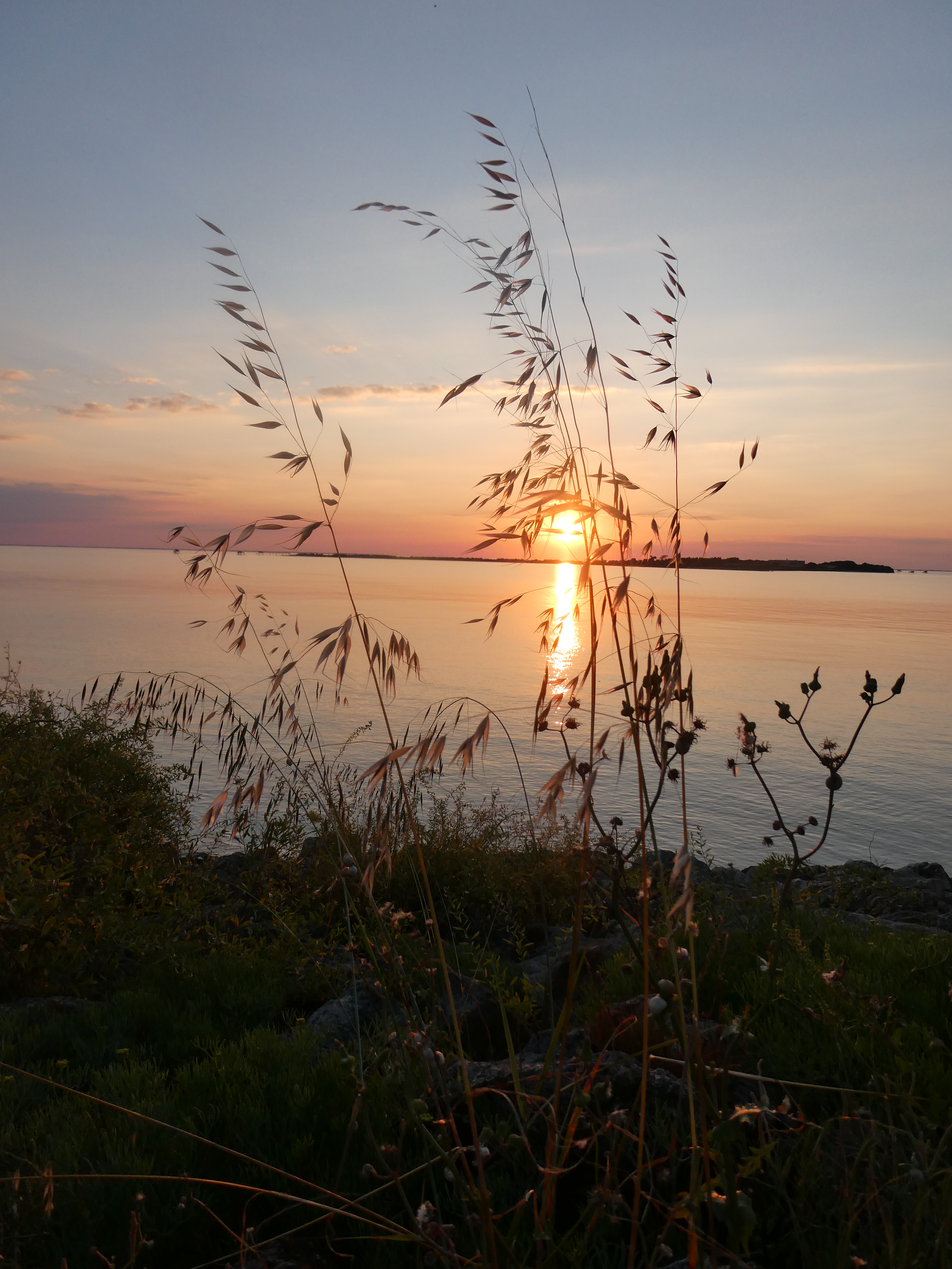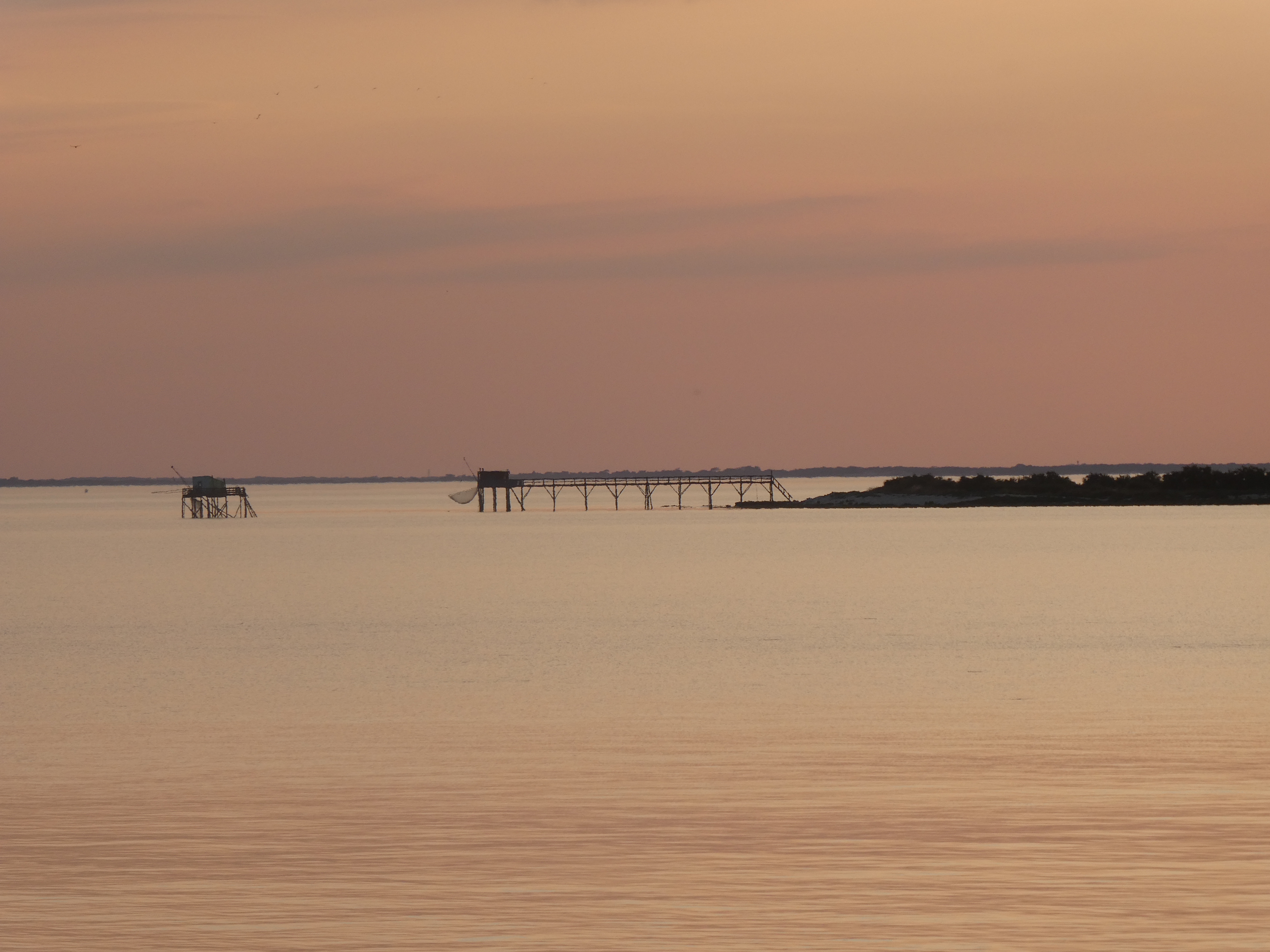 Back on site, we wait until the relative cool of early evening to get a stroll up and along the seafront. Beyond the rocky section there’s a slipway and further round, a beach, busy at 7pm, and a cafe under the trees is doing a swift trade. Continuing on, there’s a couple of ancient canon on the clifftop overlooking the fishing huts but not much else. From here we can see the Isle d’Oleron, where we’ve stayed before. All of the islands off the west coast of France are lovely and all quite different in character.