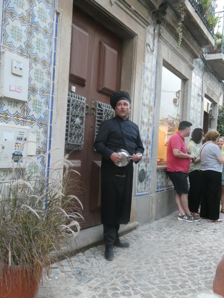 We’re halfway through our [delicious] meal when a character dressed in black robes and a jaunty hat- looking very ecclesiastical- appears near our table, holding a saucepan and a wooden spoon, which he bangs together while he squawks tunelessly, prompting us to wonder if he needs paying to go away. But he pauses, then switches on a speaker and launches into an operatic classic- and he sings wonderfully. We’re treated to two or three arias before he moves on up the street to the next restaurant.