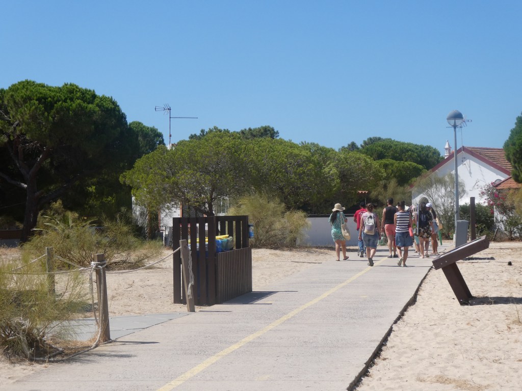 We know our way now- up off the jetty, along the path and through the restaurant area to the sand- which still has convenient fabric pathways, making sand walking easier, In spite of the huge numbers of visitors and the explosion of sunbeds and restaurants, Tavira Island has been kept as pristine as possible, with plentiful recycling and refuse bins. There’s not a speck of rubbish on the expanse of white sand, anywhere.